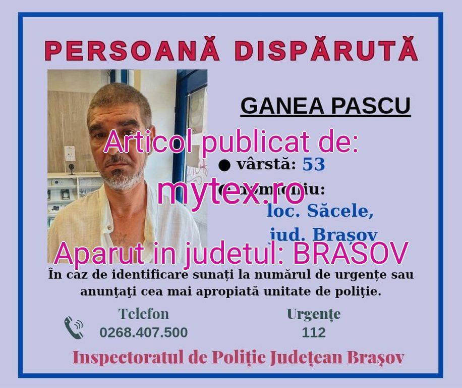 Este vorba despre un bărbat în vârstă de 53 de ani, din municipiul Săcele, care ar fi plecat de acasă în data de 30 martie și nu a mai putut fi contactat. Potrivit informațiilor, acesta a fost observat ultima dată în municipiul București.