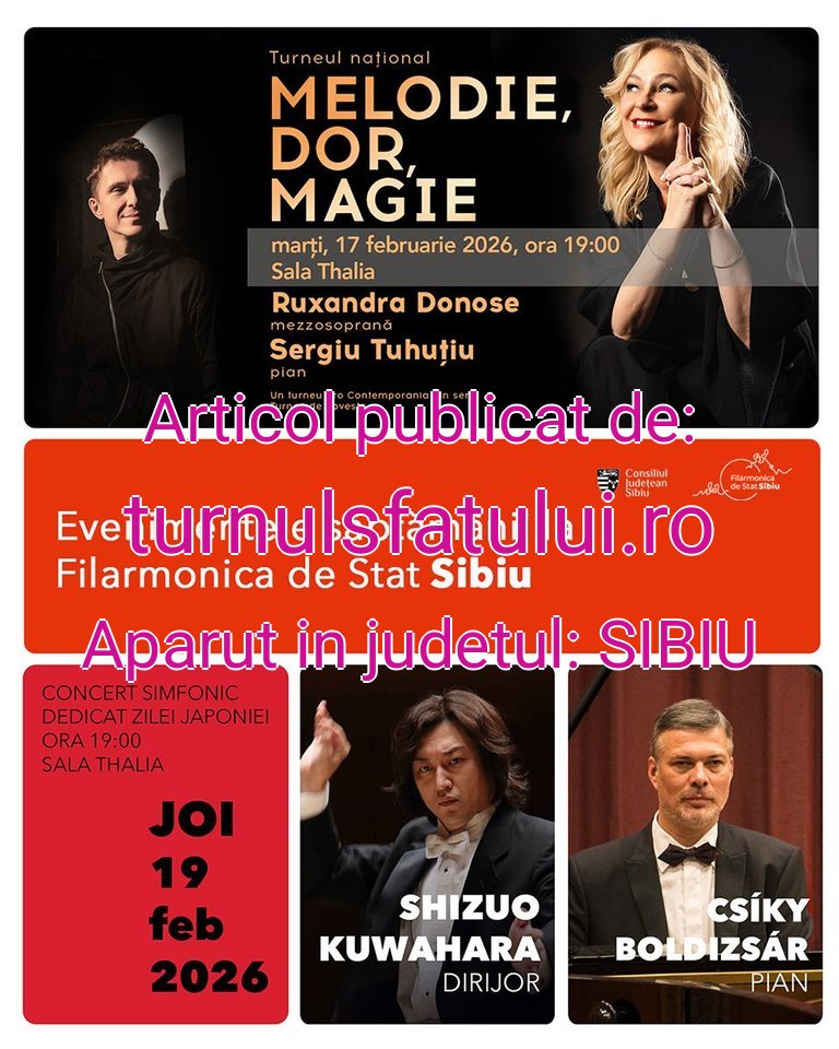 În această săptămână, Filarmonica de Stat Sibiu propune publicului două evenimente la Sala Thalia – recitalul care deschide turneul național „Melodie, Dor, Magie” și un concert simfonic dedicat Zilei Naționale a Japoniei, transmit luni reprezentanții instituției de cultură.