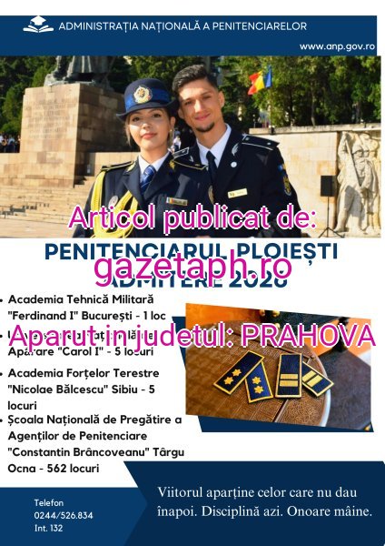 Informaţii privind condiţiile generale şi specifice de participare la concursurile de admitere, sesiunea 2026, se pot obţine de pe pagina oficială a Administrației Naționale a Penitenciarelor – secțiunea Carieră – Admitere 2026 https://anp.gov.ro/blog/admitere-2026-2/ sau telefonic la numărul 0244/526.834 int.132, Biroul Resurse Umane și Formare Profesională – Penitenciarul Ploiești.