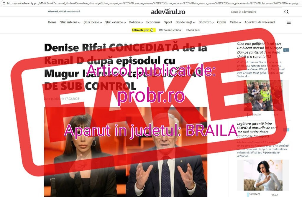 Conținutul clonează website-ul și pagina dintr-o rețea de socializare a unui cunoscut ziar generalist (Adevărul). Materialul redă un fals transcript al unei pretinse participări a guvernatorului BNR la un interviu într-un show de televiziune (“40 de întrebări cu Denise Rifai”).